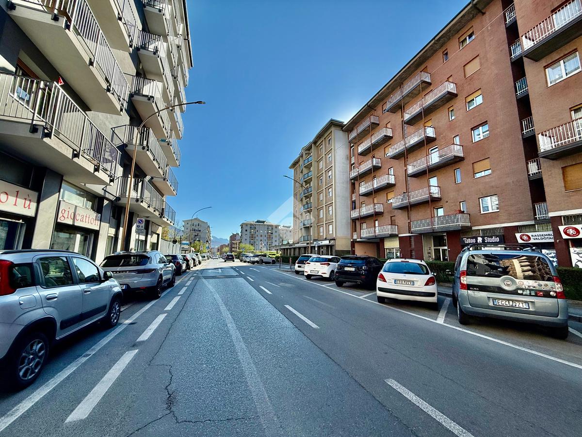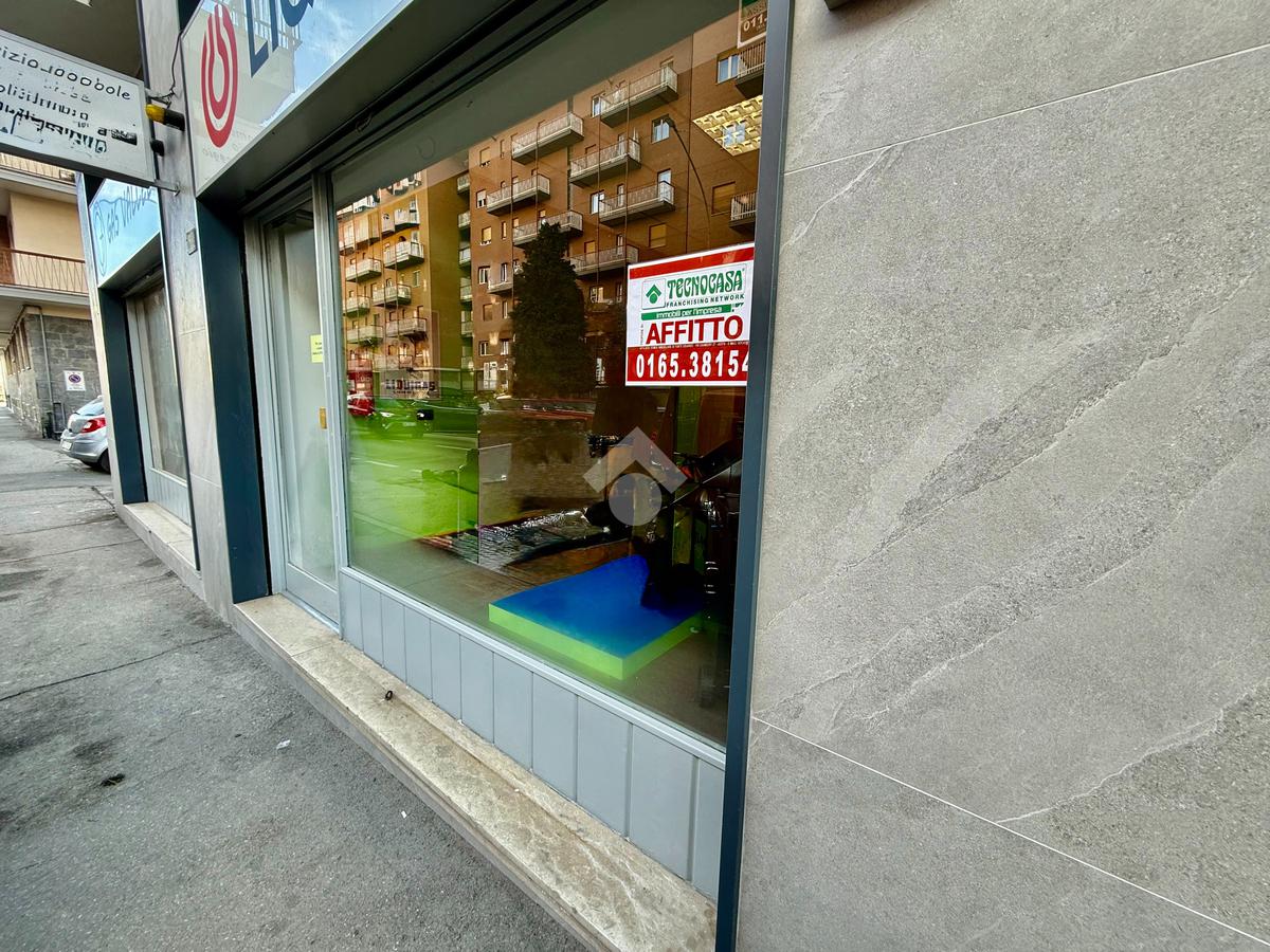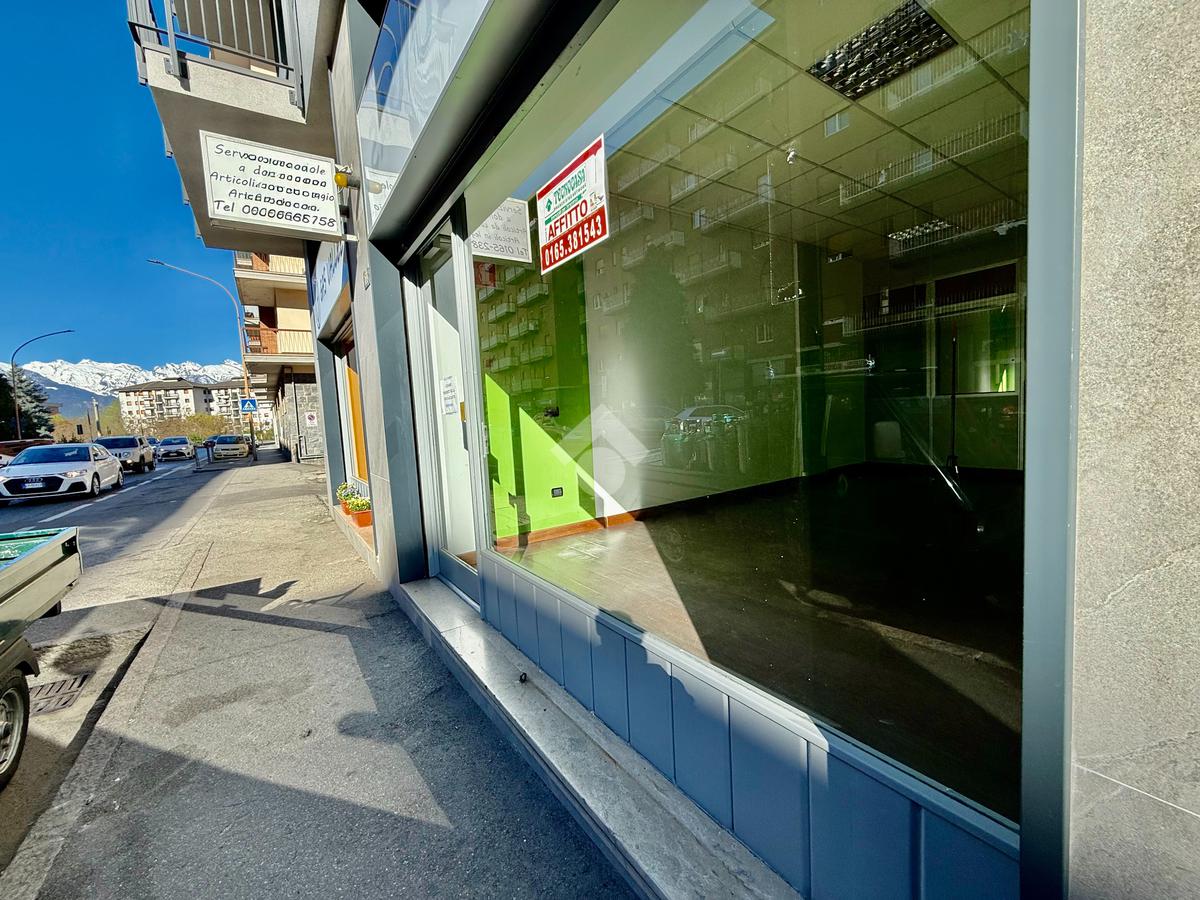 Aosta, via Chambery. In zona ad alto flusso veicolare negozio al piano terra con una vetrina fronte strada che dona una buona luminosità e visibilità agli spazi interni.
