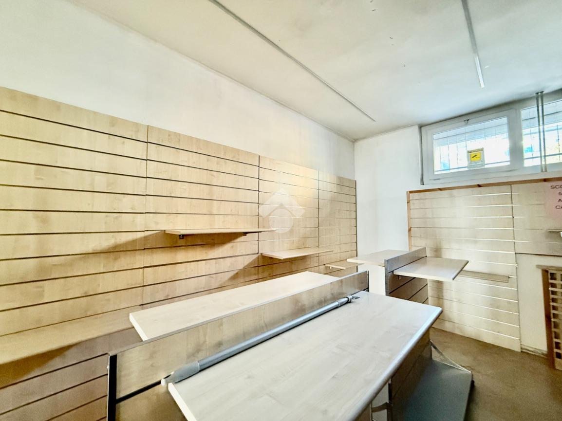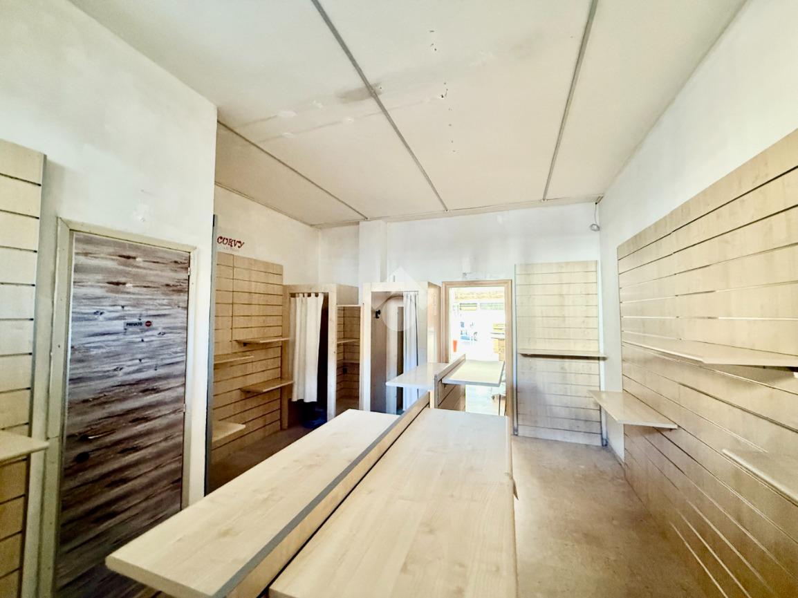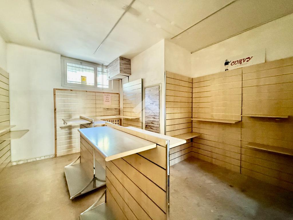 L'immobile di circa 128,00 mq è disposto su due livelli con un ingresso su un ampio vano open space, un retro ed un servizio igienico con antibagno al piano terra ed un ampio magazzino al piano interrato collegato al negozio da una scala interna.
