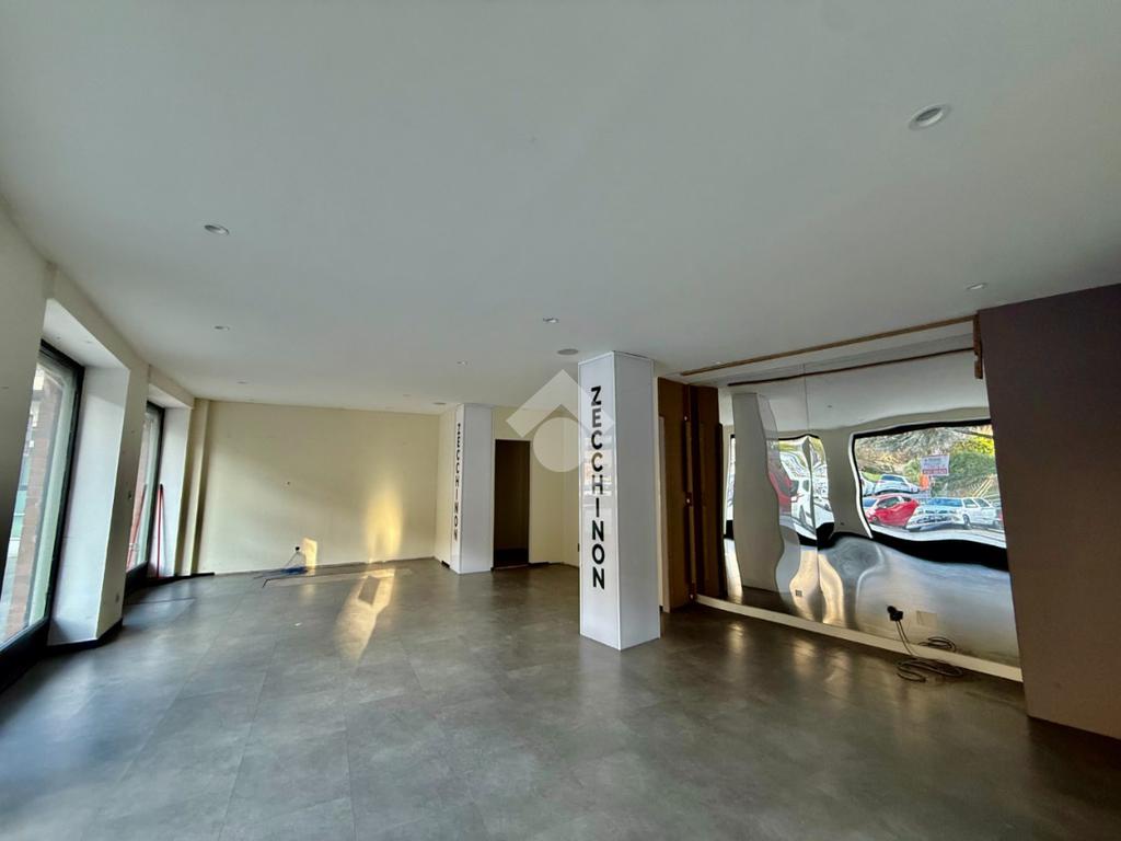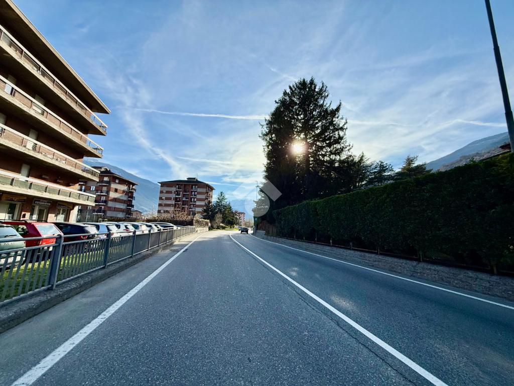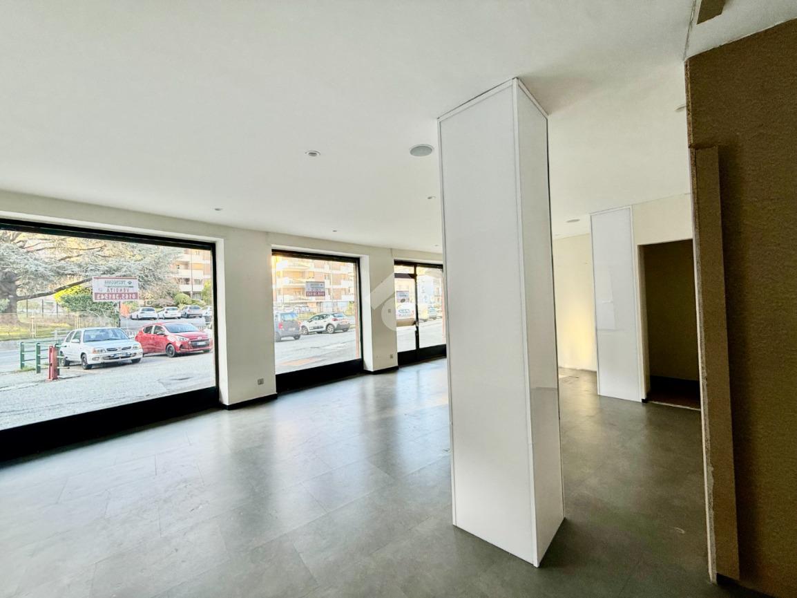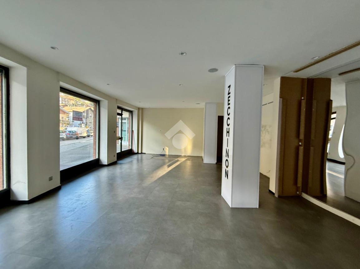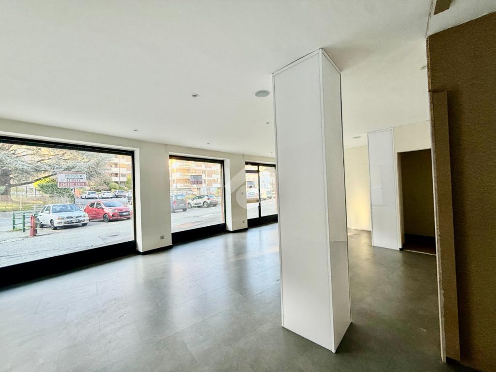 Aosta, via Parigi. In zona ad alto flusso veicolare negozio al piano terra privo di barriere architettoniche con cinque vetrine fronte statale che donano una buona luminosità e visibilità agli spazi interni.