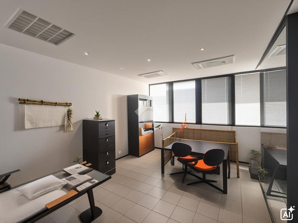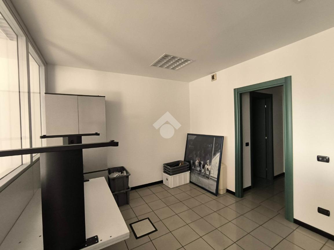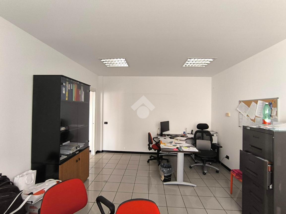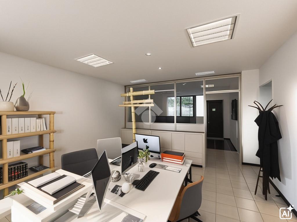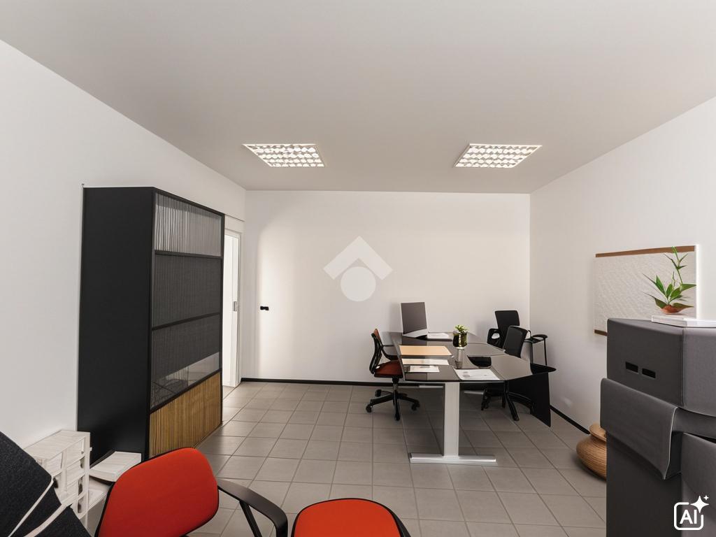 Internamente è disposto su un unico livello con un ingresso su una sala d'attesa, due locali studio ed un servizio igienico con antibagno. L'ufficio è cablato ed e dotato di pavimento flottante che consente la sopraelevazione del piano di calpestio creando un facile passaggio degli impianti tecnici.